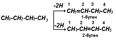 У углеводородов ряда этилена изомерия проявляется не только в строении углеродного скелета, как у предельных углеводородов, но и в положении двойной связи в молекуле. Так, например, от формулы нормального бутана можно вывести формулы двух непредельных изомеров. Чтобы их назвать, атомы углерода нумеруют, начиная с того конца цепи, к которому ближе двойная связь. Положение двойной связи обозначают в начале названия номером того углеродного атома, от которого она начинается: