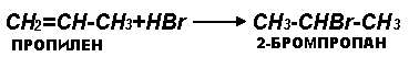 Пропилен и последующие углеводороды ряда этилена реагируют с галогеноводородами согласно правилу В.В.Марковникова. Водород присоединяется к наиболее, а атом галогена - к наименее гидрированному атому углерода: