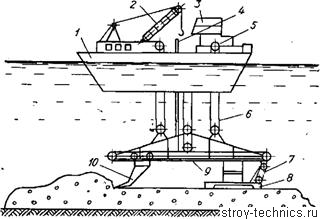 Специальная плавучая установка СПУ-1 (рис. 7) выполняет равнение каменных и песчаных постелей при волнении моря до 4 баллов. Она состоит из надводной и подводной частей, соединенных трособлочными системами. Рабочая стрела может поворачиваться от продольной оси влево и вправо на 50°. При ширине ножа 3 м и его рабочей скорости 5,6 м/мин производительность составляет около 200 м2/смену. Установке придаются водолазная станция, понтоны, буксир. Обслуживающий персонал — машинист-оператор, крановщик, матрос, три водолаза.