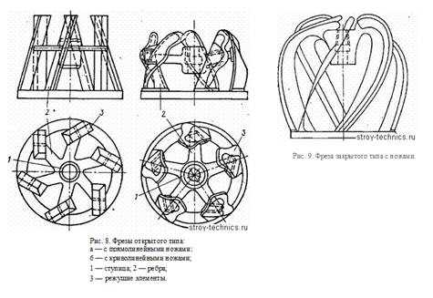 Фрезы открытого типа бывают с прямолинейными и криволинейными ножами (рис. 8), фрезы закрытого типа — с ножами двоякой кривизны (рис. 9). Существуют конструкции фрез со сменными зубьями. Основным недостатком этих фрез является одностороннее направление вращения, что обеспечивает нормальную работу только при движении рыхлителя в одну сторону. Для устранения этого недостатка разработаны конструкции реверсивных фрезерных рыхлителей, ножи которых крепятся шарнирно к спицам, обеспечивая требуемый поворот ножей при изменении вращения фрезы.