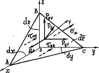 xi, отнесенные к площадкам, перпендикулярным к координатным осям Oxi, обозначаются через σij (i,j = 1,2,3), где σii называются нормальными напряжениями, а σij = σji (i≠j) — касательными напряжениями, действующими на этих площадках (рис. 5). Легко доказать следующие очень важные соотношения: