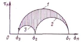 Отсюда нетрудно получить, что напряжения рп и τn могут лежать только внутри области, заштрихованной на рис.8. Это так называемая диаграмма Мора, дающая наглядное представление о напряжениях в различных сечениях, проходящих через данную точку. Здесь принята нумерация главных осей такой, чтобы выполнялись условия