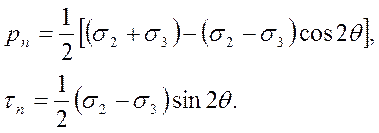 По аналогии можно записать формулы для напряжений, действующих на площадках, проходящих через две другие главные оси, иначе, для координат точек окружностей № 2 и 3 на рис. 8.