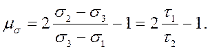 Для чистого растяжения элемента (σ1>0, σ2= σ3 = 0) μσ= —1, для чистого сжатия (σ1 = σ2 = 0, σ3<0) μσ= 1, для сдвига (σ1>0, σ2=0, σ3= — σ1) μσ= 0, для гидростатического давления (σ1 = σ2 = σ3) μσ не имеет смысла.