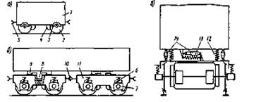 Рис. 5.1. Схемы механической части (а, б) и узлов подвешивания (в)