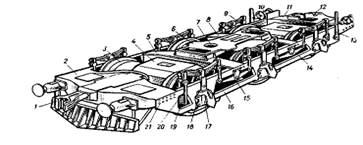 1 - автосцепка; 2 - буферный брус; 3 - зубчатая передача; 4 - тяговый двигатель; 5, 8 - поперечные балки средние; 6 - продольная шкворневая балка; 7- подпятник опоры кузова; 9 - листовая рессора; 10 - тормозной цилиндр: 11 - брус сочленения; 12 - межтележечное сочленение; 13 - тормозной рычаг; 14.- балансир; 15 - подбуксовая стружка; 16 - боковая балка; 17 - букса с подшипниками скольжения; 18 - скользящие направляющие буксы; 19 -витая пружина; 20 - рессорная подвеска; 21 - призонные болты