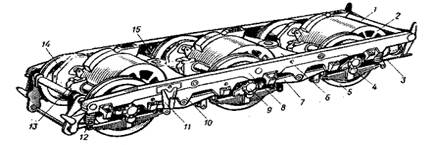 1 - концевая поперечная балка; 2 - тяговый двигатель; 3 - тормозная рычажная передача; 4 - листовая рессора; 5 - колесная пара; 6 - средняя поперечная балка; 7 - балансир; 8-сварная коробчатая боковина рамы тележки; 9 - букса поводковая с роликовыми подшипниками: 10 - кронштейн крепления балансира; 11 - кронштейн боковой опоры; 12 - витая пружина; 13 - моторно-осевые подшипники; 14 - кожух тягового редуктора; 15 - место установки центральной маятниковой опоры