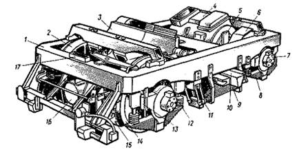 1 - сварная рама; 2 - колесная пара со спицевым диском; 3 - поперечная балка крепления тягового двигателя; 4 - тяговый двигатель; 5 - тяговая пластинчатая муфта; 6 - корпус тягового редуктора; 7- букса с роликовыми подшипниками; 8 - пластинчатая рессора буксовой ступени подвешивания; 9 - то же кузовной ступени подвешивания; 10 - балка опирания кузова; 11 - люлечные подвески; 12 - резинометаллический упругий элемент; 13 - цилиндрическая буксовая направляющая; 14 - тормозная колодка; 15 - тормозной башмак; 16 - приемная катушка АЛС; 17 - тормозной цилиндр