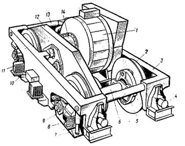 1 - тяговый двигатель; 2 - колесная пара; 3 - рама тележки; 4 - блок-тормоз; 5 - шарнирное кольцо тяговой муфты; 6 - полый вал тяговой муфты; 7 - гидравлический гаситель вертикальных колебаний тележки; 8 - витая пружина буксовой ступени рессорного подвешивания; 9 - букса поводковая; 10 - консольная часть поперечной балки; 11 - резинометаллические блоки кузовной ступени рессорного подвешивания; 12 - корпус раздаточного редуктора; 13 - концевая балка; 14-муфта соединения валов тягового двигателя и редуктора