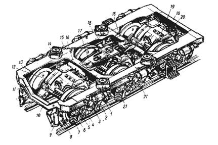 1 - тормозной цилиндр; 2 - воздухопровод; 3 - демпфер; 4 - букса; 5- рама; 6 - пружина; 7 - поводок; в - рычаг подвески тормозных колодок; 9 - труба для подачи песка; 10 - концевая балка; 11 - колесная пара; 12 - тяговый электродвигатель; 13 - боковина; 14 - опора; 15-масленка; 16 - средняя поперечная балка; 17 - шкворневая балка; 18 - шкворневое устройство; 19 - кожух тягового редуктора; 20 - механизм подвешивания тягового двигателя; 21 - кронштейны буксовых поводков