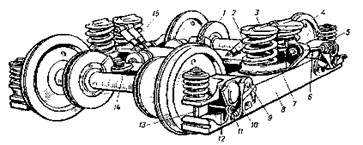 1-тормозной диск: 2 --пружины кузовной ступени рессорного подвешивания; 3 - шарнирная опора кузовных пружин; 4 - колесная пара; 5 - пружина буксовой ступени, рессорного подвешивания; 6 - тяговый поводок; 7 - подрессорный брус; 8 - боковина рамы тележки; 9 - шарнир корпуса рычажной буксы; 10 - страховочная скоба; 11 - поперечный буксовый поводок; 12 - корпус буксы; 13 - вертикальная подвеска буксовой пружины; 14 - дисковый тормоз; 15 - гасители колебаний кузовной ступени рессорного подвешивания