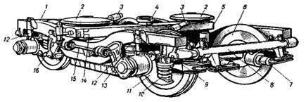 1 - сварная рама тележки; 2 - пневморессора; 3 - гидравлический гаситель поперечных колебаний; 4 - гнездо шкворня; 5 - подрессорный поворотный брус; 6 - тормозной диск; 7 - тормозной цилиндр; 8 - концевая поперечная балка; 9 - резинометаллический шарнир буксового поводка; 10 - витая пружина буксовой ступени рессорного подвешивания; 11 - букса; 12 - гидравлический гаситель вертикальных колебаний тележки; 13 - электромагнитный рельсовый тормоз; 14 - скользун опирания подрессорного бруса; 15 - тяговый поводок; 16 - гидравлический гаситель вертикальных колебаний кузова