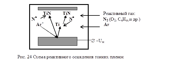 Реактивным методом можно получить пленки оксидов, нитридов, карбидов и т.п. (Рис.24). Условием стабильности процесса является выполнение неравенства pреак.< pкр, где pреак – парциальное давление реактивного газа; pкр - критическое давление, при котором происходит изменение химического состава поверхности мишени, приводящее к заметному изменению режимов осаждения пленки (т.е. скорость испарения или распыления мишени должен быть больше, чем скорость ее окисления, нитридизации и т.п.). В качестве примера можно привести изменение энергии межатомных связей U0 распыляемого материала и его оксида: U0(Ti)=4,9эВ; U0(TiO)=6,8 эВ; U0(Al)=3,2 эВ; U0(Al2O3)=19,2 эВ. Величина pкр рассчитывается исходя из условия наибольшей вероятности осуществления химической реакции на подложке