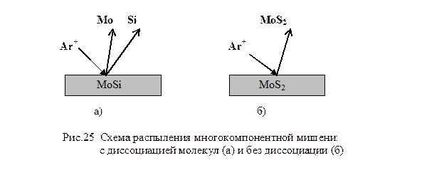 Испарением или распылением мишеней сложного состава можно получать, например, магнитооптические пленки GdCo или SmCo, причем в первом случае состав мишени: 25% гадолиния и 75% кобальта, а во втором – 50% самария и 50% кобальта; силициды тугоплавких металлов MoSi (Рис.25 а), WSi, PtSi и т.п., причем стехиометрические составы пленки и мишени совпадают несмотря на то, что каждый элемент распыляется отдельно и существует различие в коэффициентах распыления компонентов; дисульфиды и диселениды металлов (твердые смазки), например, MoS2 (Рис.25 б), который распыляется целой молекулой, т.к. связь между атомами серы и молибдена значительно больше межмолекулярных связей.