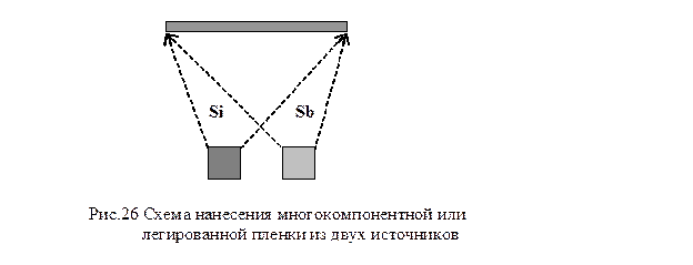 Осаждение многокомпонентных или легированных пленок из нескольких источников, например, полупроводниковой пленки Si легированной Sb (Рис.26), позволяет получать необходимый стехиометрический состав тонкопленочного покрытия, например, сверхпроводящей пленки Nb0,748Ge0,252, строго управлять уровнем легирования (можно получать сложные профили легирования, сверхрешетки с практически любым l-параметром кристалла).