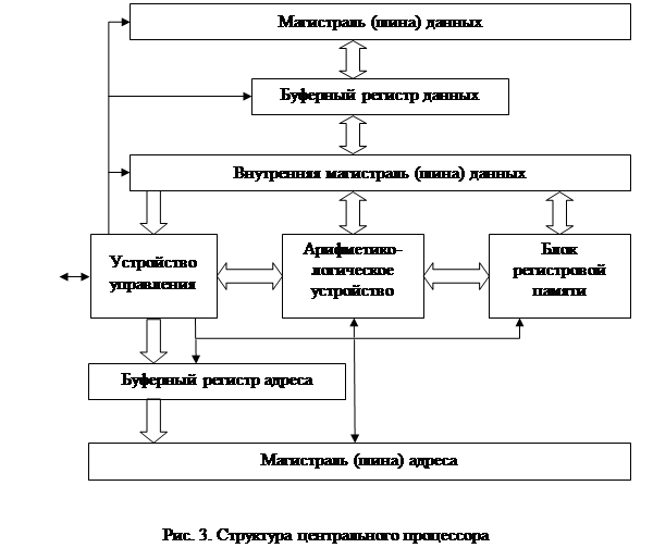 На этом рисунке тонкими стрелками показаны сигналы управления устройствами и узлами процессора, а широкими – направление пересылки информации.