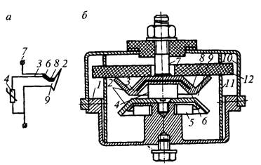 Рис. 9.8. Искровые промежутки ИПМ с пластмассовыми (а) и металлическими (б) экранами; 1 — кольцевой пластмассовый экран; 2 — стальная шайба; 3 — крышка; 4 — гайка; 5 — изолированный стержень; 6 — корпус; 7 — втулка изолирующая; 8, 9 — шайба контактная; 10 — металлический экран; 11 — слюдяная прокладка