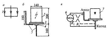 Рис. 9.11. Диодный заземлитель ЗД-1: а — электрическая схема; б — внешний вид; в — схема проверки диодного заземлителя перед установкой; 1 — диоды В Л 200-8 или ВЛ200-10; 2 — корпус; 3 — герметизирующая прокладка; 4— изолирующая втулка; 5 — монтажные выводы; б — мегомметр; 7 — диодный заземлитель