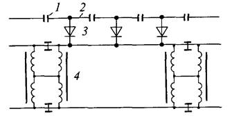 Рис. 9.13. Защитное устройство на основе диодного заземлителя и искровых промежутков: а — электрическая схема; б — внешний вид; 1 — диоды; 2 — диодный заземлитель; 3 — зажим плашечный; 4 — искровые промежутки