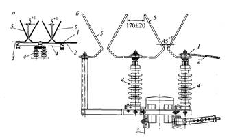 Рис. 9.14. Роговый разрядник для участков постоянного (а) и переменного (б) тока; 1 — держатель проводов опорного изолятора; 2 — провод к контактной подвеске; 3 — провод к общей линии заземления; 4 — изоляторы; 5 — дугогасящие рога