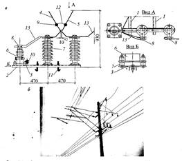 Рис. 9.15. Ограничитель перенапряжения постоянного тока (а); установка ОПН на опоре (б): 1 — кронштейн; 2 — балка разрядника; 3 — планка опорная; 4, 5 — дугогосящие рога; 6 — ОПН; 7 — изолятор; 8, 9, 10 — зажимы соединительный, струновой, заземляющий; 11 — болт крюковой; 12 — проволока 01,4 мм; 13 — провод М-70 или ПБСМ-70