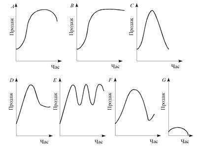 А – традиційна крива; В – бум; С – крива захоплення; D – довгострокове захоплення; Е – сезонність або мода; F – крива поновлення або ностальгії; G - провал