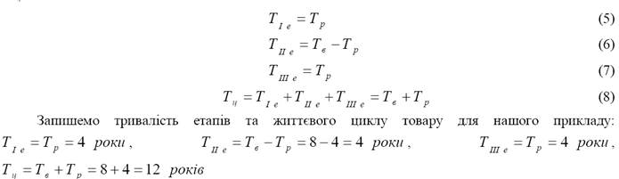 Також визначаємо часові параметри життєвого циклу товару. Тривалість першого (Т I е) і третього (Т III е) етапів дорівнює розрахунковому періоду експлуатації виготовленої продукції. Тривалість другого етапу (Т I Iе) становить різницю між загальним періодом виготовлення продукції і розрахунковим періодом експлуатації виготовленої продукції. Тривалість всього циклу (Т ц ) – сума трьох етапів. Отже: