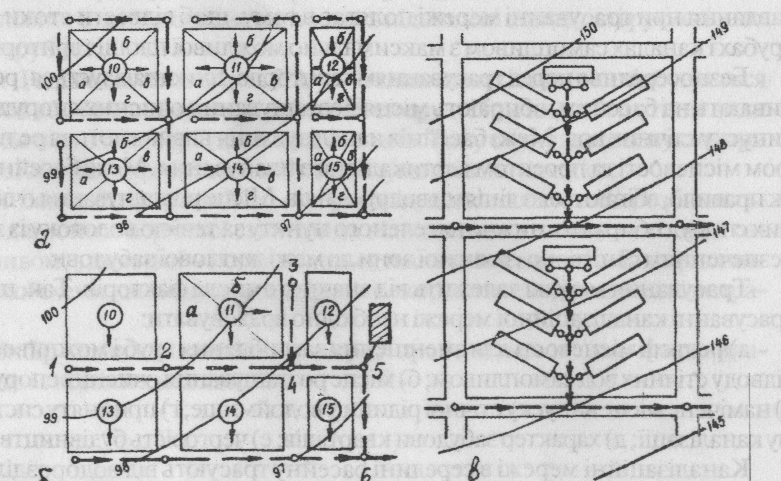 Drawing 2.3. Schemes of sewage network tracing: a) by covering scheme; b) from lower parts of blocks; c) through-block; a, b, c, d – block’s sectors, 10-15 blocks numbers; 1-6 nodes wells.