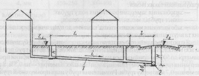 where h is least deeping of tubes in the most remote and unprofitable wells located yard network; i - bow pipe yard or quarterly network, (L + l)- length of yard or block network from far well to place of connection to street network; Z2, Z1 -marks of the ground surface near the well outside and most distant yard well, and delta d - the difference in diameters of pipelines of street and quarterly network at their connection.