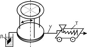 В данной работе затухающие колебания изучаются на диске, подвешенному на трифилярном подвесе (рис. 3). При отклонении диска на некоторый угол в горизонтальной плоскости он начинает выполнять колебания. К диску укреплен указатель У, к концу которого присоединена воронка с песком. При движении тележки Т песок вычерчивает на бумаге, помещенной на тележке, затухающие колебания. Затухания обеспечивается лопаточкой Л, которая движется в сосуде с вязкой жидкостью.