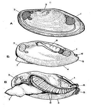 А — внутрішня поверхня правої стулки раковини: 1 — відбиток на місці прикріплення переднього мускула-замикача, 2 — те ж заднього мускула-замикача, 3 — зв'язка, що сполучає обидві стулки на спинній стороні; Б — тіло беззубки, вийнятої з раковини: 1 і 2 — м'язи-замикачі, 4 — край мантії. 5 — сифон, через які вода входить в мантыйну порожнину, 6 — вивідний сифон, 7 — нога, 8 — що просвічують внутрішні органи — печінка і серце; В — беззубка з відрізаною лівою складкою мантії; 4 — край правої мантії, 5 і 6 — сифони, 8 — ліва зовнішня і внутрішня пластинки зябра.