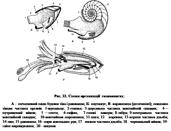 щупальцями (вісім у восьминогів, десять у каракатиць і кальмарів). На щупальцях у декілька рядів розташовані присоски. Голо ва велика (рис.22).