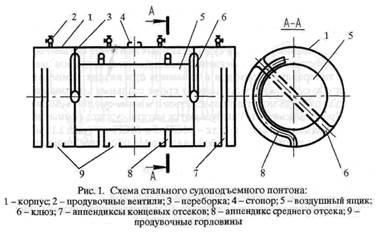 Стальные судоподъемные понтоны (рис. 1) представляют собой полу-замкнутые цилиндрические или цилиндрические с оконечностями в виде усеченных конусов резервуа-ры, разделенные по длине попереч-ными переборками на два или три отсека. Внутри корпуса всех стальных понтонов размещен гер-метичный резервуар, называемый воздушным ящиком (рис.1, п.5). Воздушный ящик предназначен для придания погруженному в воду с заполненными водой отсеками небольшой (порядка 3 – 5 тонн) отрицательной плавучести и создания при положительной остойчивости понтона за счет расположения оси воздушного ящика выше оси понтона и погрузки на днище понтона твердого балласта. Глубина погружения понтона определяется прочностью воздушного ящика.