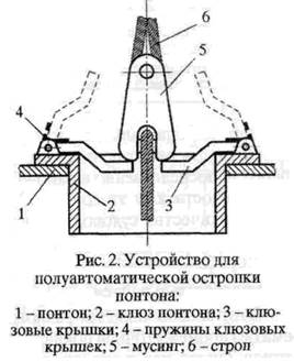 К корпусу корабля судоподъемные понтоны крепятся с помощью судоподъемных стропов из стальных канатов, проходящих через закрепленные на днище и палубе клюзы, соединенные между собой трубами. Для более полного использования грузоподъемности понтонов клюзы расположены под углом 23 … 40о к диаметральной плоскости. Для закрепления огонов строп на палубе понтонов резмещены специальные стопорные устройства. Также используются устройства для полуавтоматической остропки понтонов (рис. 2).