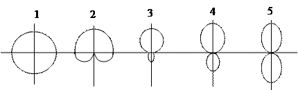 1 – приемник давления (q = 0); 2 – кардиоида, для комбинированного приемника (приемника давления и приемника градиента давления) с одинаковой чувствительность (q = 0,5); 3 – суперкардиоида (q = 0,63); 4– гиперкардиоида (q = 0,75); 5 – косинусоида (симметричный приемник градиента давления, q = 1)