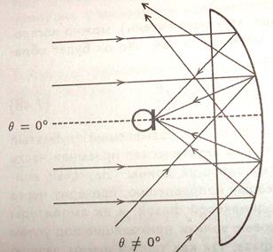 На практике часто встречаются остро направленные микрофоны – рефлекторные. В них капсюль не направленной или однонаправленной ХН помещается в фокусе параболического отражателя (рис. 13.6). Звуковые волны после отражения концентрируются в фокусе параболы, в месте расположения подвижного элемента капсюля. Волны, приходящие под углом к оси параболы рассеиваются рефлектором не попадая на микрофон. ХН меняется от практически ненаправленной на НЧ (диаметр рефлектора меньше длины волны) до узкого лепестка на ВЧ. ЧХ имеет подъем в сторону ВЧ, который компенсируется или электрическим путем, или спецконструкцией капсюля.