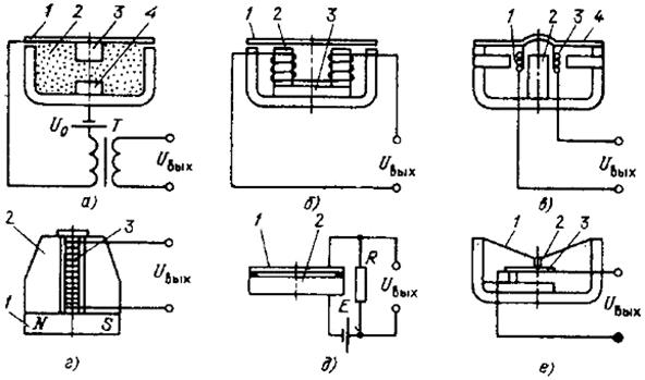 Электродинамические (катушечные, ленточные), конденсаторные (в том числе электретные), электромагнитные, пьезоэлектрические, угольные.