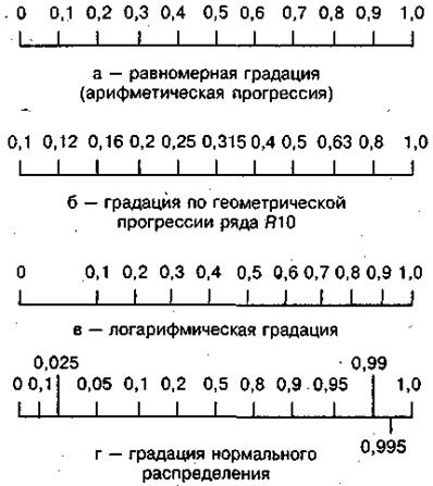 Так как уровень качества и многие частные (единичные) характеристики (показатели) качества имеют значения в диапазоне от нуля до единицы, то некоторые из таких наиболее часто используемых градаций шкал приведены на рис. 2.2.