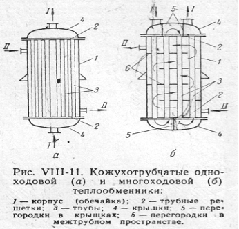 В многоходовом теплообменнике с помощью поперечных перегородок 5, установленных в крышках теплообменника, трубы разделены на секции, по которым движется жидкость.