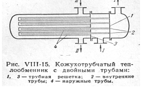 Двухтрубчатые теплообменники (теплообменники «труба в трубе») состоят из нескольких последовательно соединенных трубчатых элементов, образованных двумя концентрически расположенными трубами. Один теплоноситель движется по внутренним трубам, другой — по кльцевому аззору между внутренними и наружными трубами. Достоинства — довольно высокая скорость жидкости, что позволяет получать высокие коэффициенты теплопередачи и более высокие нагрузки на единису массы аппарата, а также снижать скорость загрязнения аппарата вследствие высоких скоростей движения сред. Недостатки — громоздкость, металлоемкость.