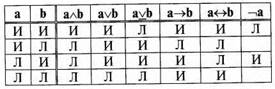 Как видим, конъюнкция (аÙb) истинна только тогда, когда истинны оба простых суждения, входящих в нее. Надо отметить, что конъюнкция, состоящая не из двух, а из большего количества простых суждений, также истинна только в том случае, когда истинны все входящие в нее суждения. Во всех остальных случаях она является ложной. Нестрогая дизъюнкция (aÚb), наоборот, истинна во всех случаях за исключением того, когда оба входящих в нее простых суждения ложны. Нестрогая дизъюнкция, состоящая не из двух, а из большего количества простых суждений, также ложна только тогда, когда ложны все входящие в нее простые суждения. Строгая дизъюнкция (aÚb) истинна только тогда, когда одно входящее в нее простое суждение истинно, а другое ложно. Строгая дизъюнкция, состоящая не из двух, а из большего количества простых суждений, истинна только в том случае, если истинно только одно из входящих в нее простых суждений, а все остальные ложны. Импликация (а®b) ложна только в одном случае – когда ее основание является истинным, а следствие ложным. Во всех остальных случаях она истинна. Эквиваленция (а↔b) истинна тогда, когда два составляющих ее простых суждения истинны или же когда они оба являются ложными. Если одна часть эквиваленции истинна, а другая ложна, то эквиваленция ложна. Проще всего определяется истинность отрицания: когда утверждение (а) истинно, его отрицание (Øа) ложно; когда утверждение (а) ложно, его отрицание (Øа) истинно.