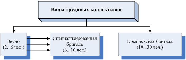 При производстве строительных работ используется коллективный труд рабочих. Простые процессы выполняются звеньями строительных рабочих, законченные конструктивные элементы – строительными бригадами, состоящими из звеньев (рис. 2.2).