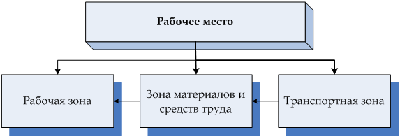 Рабочее место – это объемная зона, оснащенная необходимыми средствами для трудовой деятельности одного или нескольких работников. Рабочие места классифицируют по ряду признаков (рис. 2.4). Рабочее место включает следующие зоны: рабочую, зону размещения предметов и средств труда, зону транспортирования материалов. Очень часто зоны рабочая и зона материалов сливаются в одну (рис. 2.5).
