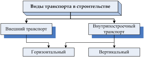 Для каждого вида грузов предусмотрены свои средства транспортирования. Весь транспорт на строительстве принято разделять по отношению к строительной площадке на внешний и внутрипостроечный, по направлению подачи грузов на горизонтальный и вертикальный (рис. 3.2).