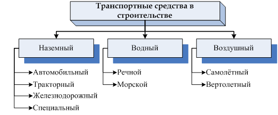 Для доставки грузов на объекты строительства применяют наземные, водные и воздушные транспортные средства (рис. 3.3). Свыше 95% грузов перемещают наземным транспортом (железнодорожным, автомобильным, тракторным).