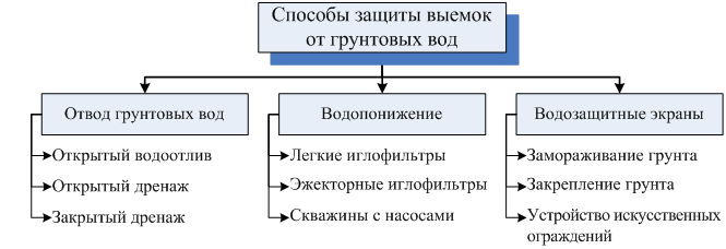 Наиболее распространенными способами устройства водозащитных экранов является замораживание грунта, закрепление инъецированием в грунт цементных, силикатных или полимерных растворов, устройство искусственных свайных ограждений.