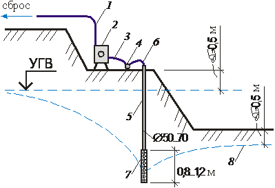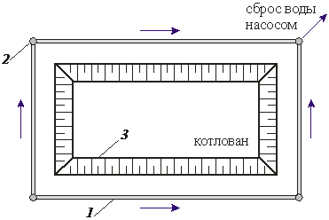 1 – водоотводная канава; 2 – приямок – зумпф; 3 – всасывающий патрубок; 4 – насос;