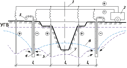 1 – электрический кабель; 2 – источник постоянного тока; 3 – магистральный трубопровод; 4 – иглофильтр (катод); 5 – металлический стержень (анод); 6, 7 – депрессионная кривая до и после включения электрической цепи соответственно; l1 – активная зона при двухрядном расположении анодов; l2 – зона обратного действия; l3 – активная зона при однорядном рас-