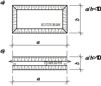 | Рис. .. Виды выемок: а – котлован; б - траншея |