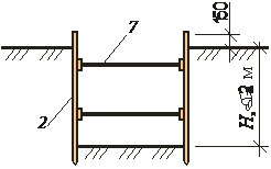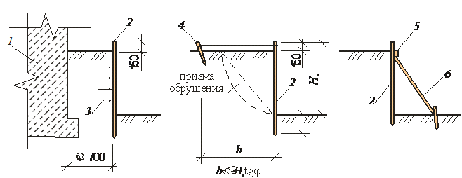 Для перемещения рабочих в пазухе фундамента расстояние от боковой поверхности возводимой конструкции до откоса с коэффициентом заложения m<0,5 или шпунтового ограждения принимают не менее 0,6 м (рис. 5.10).